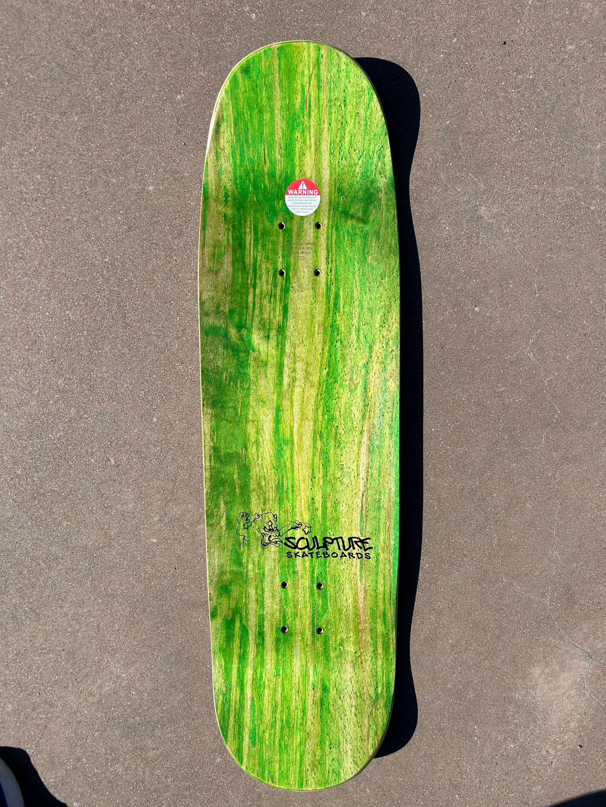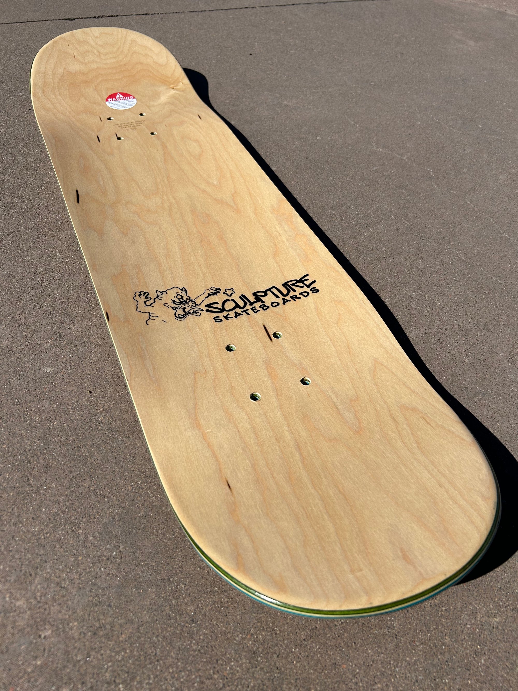 Sculpture's signature counter sunk bolt holes and sharp top rails on side edges => a longer lasting board, built for better flip tricks
